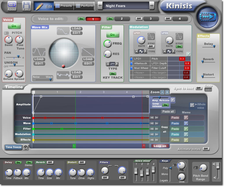 - Each voice is a complete synthesiser engine with its own Timeline, oscillators, filter, modulation options and effects routing.